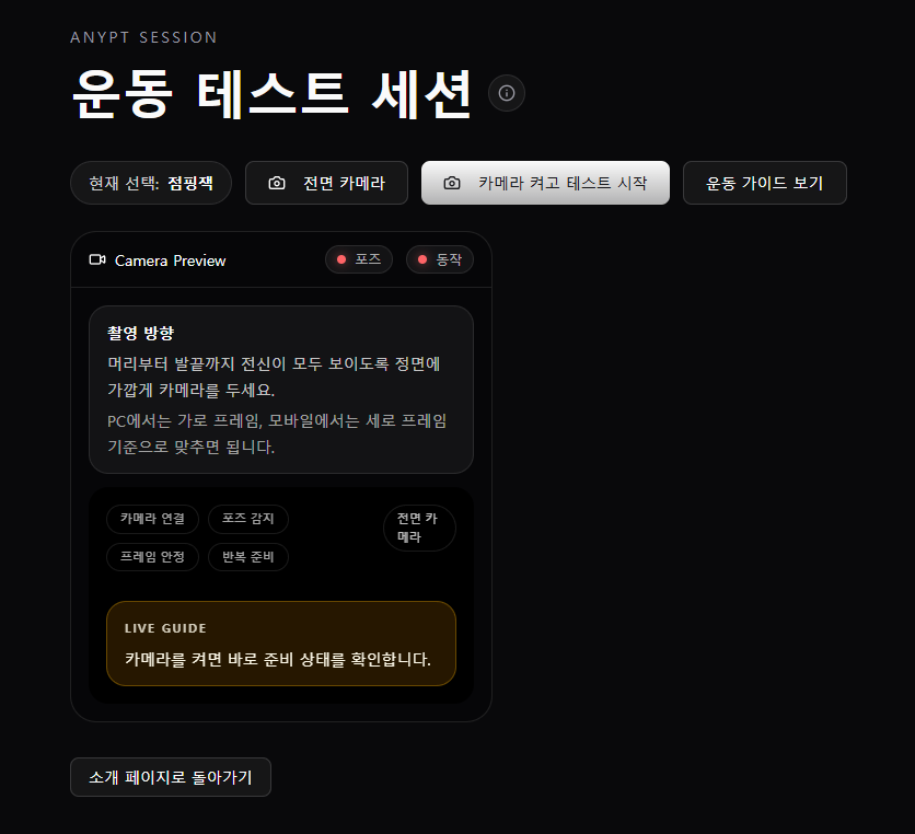 - 카메라 켜고 테스트 시작 (모바일의 경우 전/후면 카메라 설정 가능)