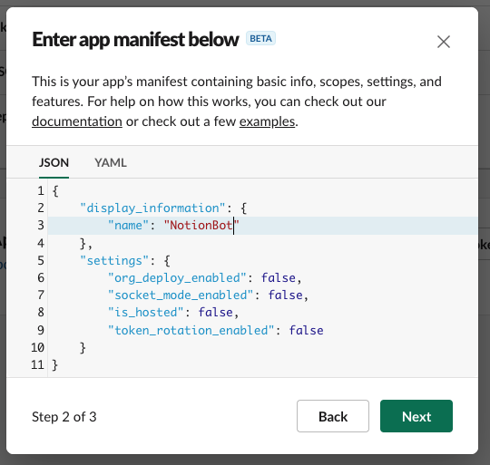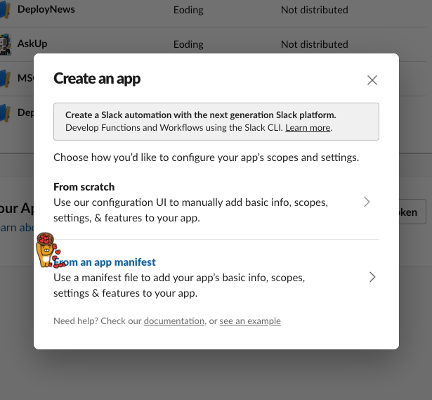 굳이 새로 생성할 필요는 없다. 안 쓰는 봇이 있다면 그걸로 대체해도 된다. 그렇지만 일단 새로 생성해보자. UI로 할거면 From Scratch, Json이나 Yaml로 하고 싶으면 From an app manifest 선택 후 자기 Slack Workspace 선택