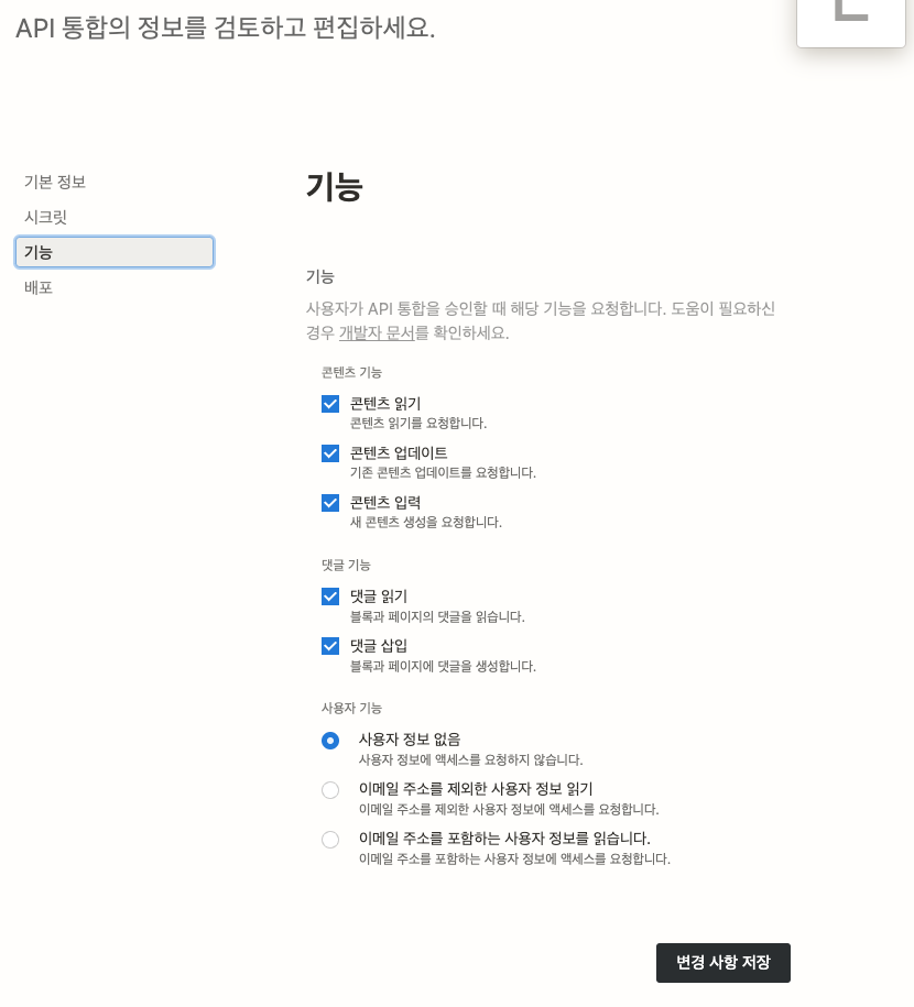 6. 기능에서 콘텐츠 읽기만 선택 (더 많은 기능을 원한다면 더 클릭) / 사용자 정보 없음 클릭 후 변경사항 저장