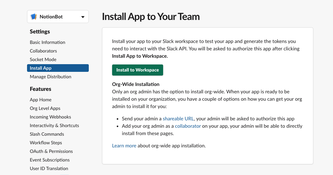 - users:read: Slack 워크스페이스의 사용자 목록을 읽는 권한으로, 봇이 사용자를 인식하고 다양한 작업을 수행할 수 있도록 해줍니다.