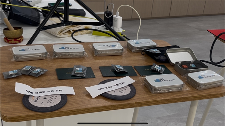 골든벨을 진행해서 여러 굿즈 (키캡, 스티커, AWS 크레딧 등)을 나눠주셨다.