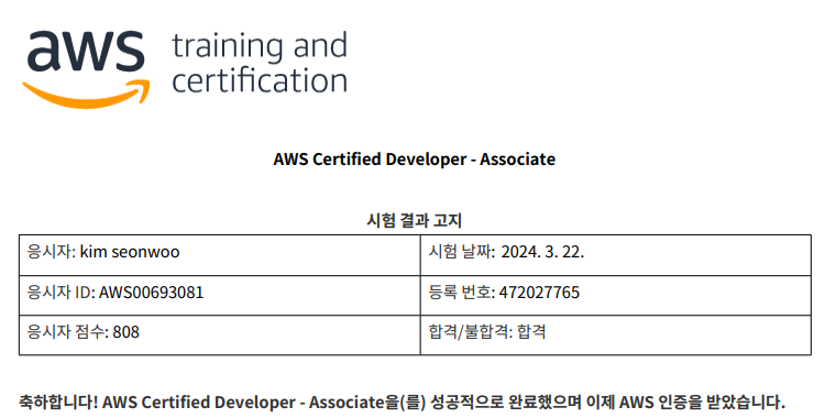 이번엔 3월 22일에 취득한 AWS Certified Developer - Associate 자격증 합격 후기를 남겨봅니다.