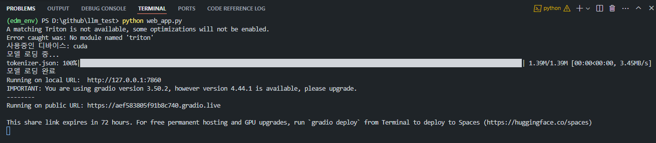 저 사이에 있는 public URL을 누르면 외부에서 접근이 가능해진다. 대신 모델에서 음원 생성 수행은 로컬 PC에서 수행한다.