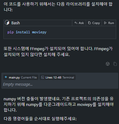 추가 라이브러리가 필요하다고 해서 설치를 하고 돌려보니 version conflict에러가 발생한다. 이 경우 터미널 창의 오류메세지를 클릭하고 Chat으로 넘겨서 문제를 해결한다.