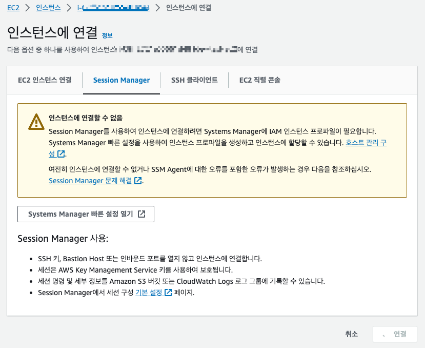 이렇게 하면 바로 될 줄 알았지만, 그렇지 않다. 왜냐하면 amazon-ssm-agent가 켜져는 있지만 새로 올리지 않아서 활성화 되지 않는 것처럼 보이기에 아래와 같은 표시가 나올 수 있다.