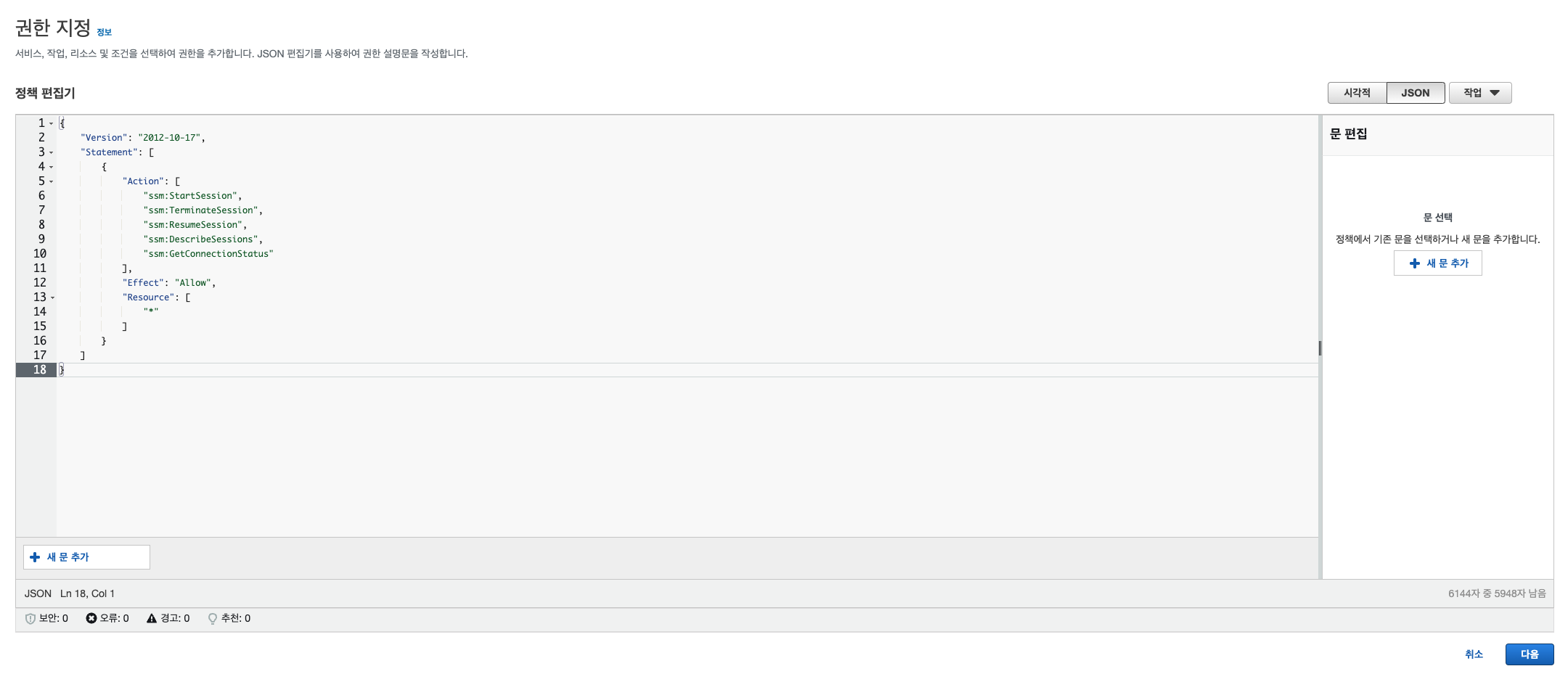 startSession 관련 관리형 정책이 없으므로 위의 우하단의 권한 추가를 눌러서 정책을 추가로 생성해야 한다.