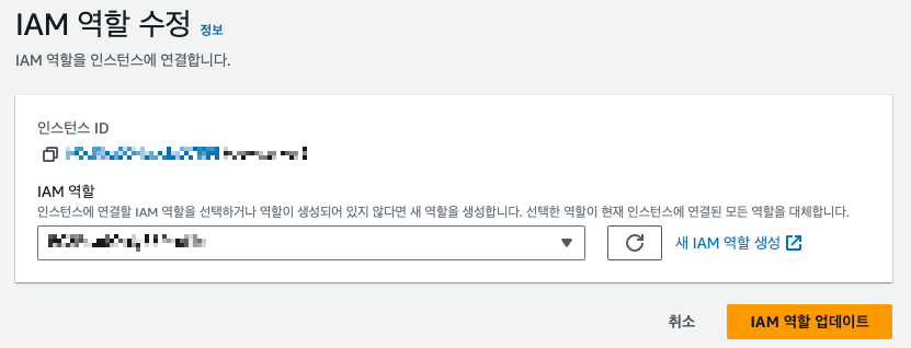 아까 만든 역할이 표시된다면, 그 역할을 선택하고 IAM 역할 업데이트를 적용하면 된다.