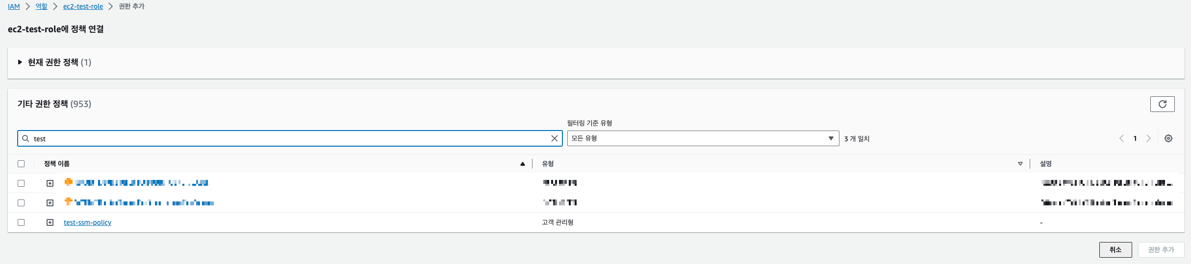 test-ssm-role이란 이름으로 만들어봤다. 클릭한 다음 권한 추가를 눌러서 추가한다.