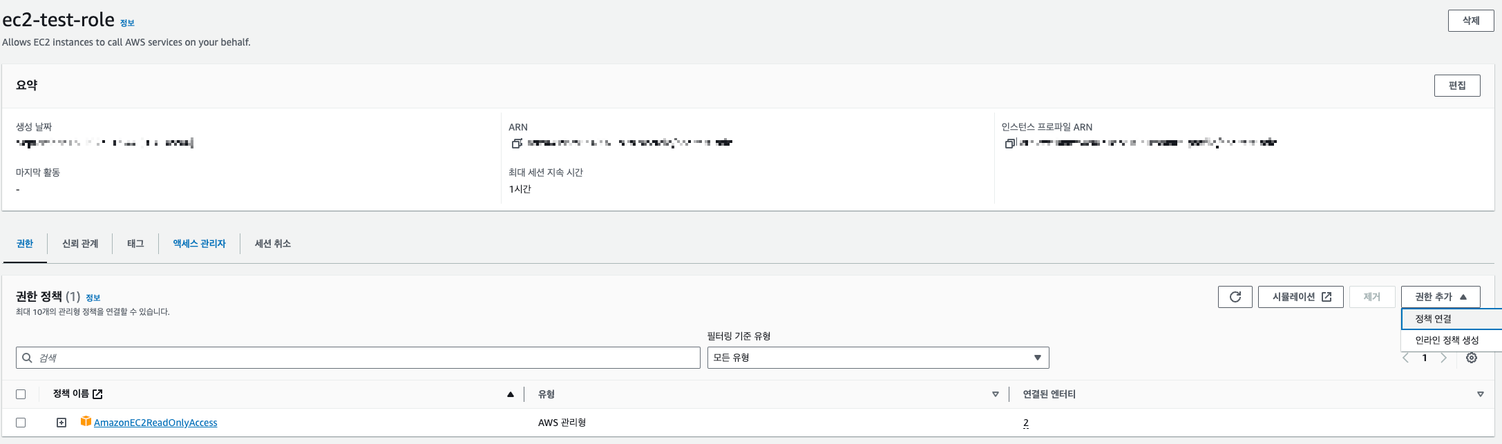 그 다음 아까 만든 역할을 다시 선택한 뒤 정책을 추가하자